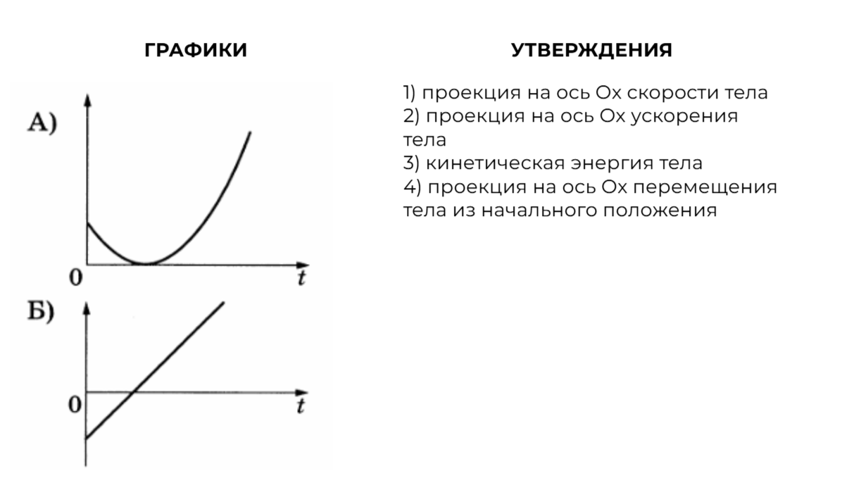На рисунке показан график зависимости координаты х тела, движущегося вдоль оси Ох, от времени t (парабола). Графики А и Б представляют собой зависимости физических величин, характеризующих движение тела, от времени t.