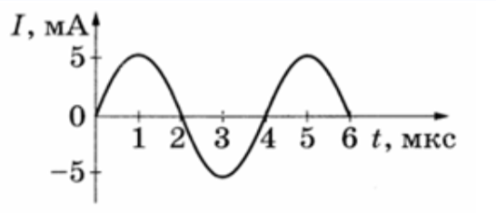 На рисунке приведён график зависимости силы тока от времени в колебательном контуре. Сколько раз в течение первых 10 мкс энергия катушки достигает максимального значения?