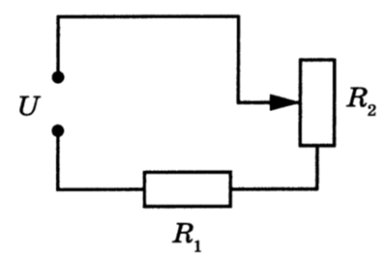 Резистор R1 и реостат R2 подключены последовательно к источнику напряжения U (см. рисунок). Как изменятся сила тока в цепи и напряжение на реостате R2, если уменьшить сопротивление реостата? Считать, что напряжение на выводах источника остается при этом постоянным.