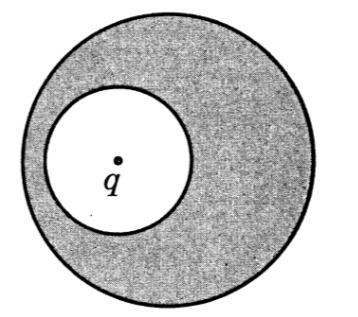 В левой половине незаряженного металлического шара располагается крупная шарообразная полость, заполненная воздухом. Шар находится в воздухе вдали от других предметов. В центр полости помещен отрицательный точечный заряд q < 0 (см. рисунок). Нарисуйте картину линий напряженности электростатического поля внутри полости, внутри проводника и снаружи шара. Если поле отсутствует, напишите в данной области: Е = 0. Если поле отлично от нуля, нарисуйте картину поля в данной области, используя восемь линий напряжённости. Ответ поясните, указав, какие физические закономерности Вы использовали для объяснения.
