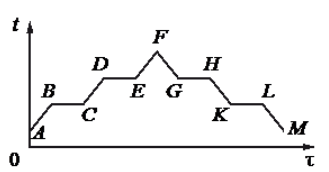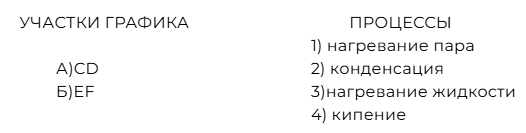 В цилиндре под поршнем находилось твёрдое вещество. Цилиндр поместили в горячую печь, а через некоторое время стали охлаждать. На рисунке схематично показан график изменения температуры t вещества с течением времени . Установите соответствие между участками графика и процессами, отображаемыми этими участками.