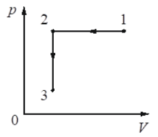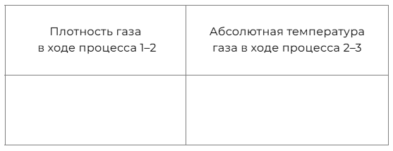 1 моль одноатомного идеального газа участвует в процессе 1–2–3, график которого изображён на рисунке в координатах p–V, где p – давление газа, V – объём газа. Как изменяются плотность ρ газа в ходе процесса 1–2 и абсолютная температура Т газа в ходе процесса 2–3? Масса газа остаётся постоянной.