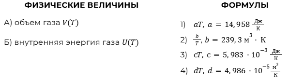 Установите соответствие между физическими величинами, характеризующими гелий, и формулами, выражающими их зависимость от абсолютной температуры T газа в условиях данной задачи.