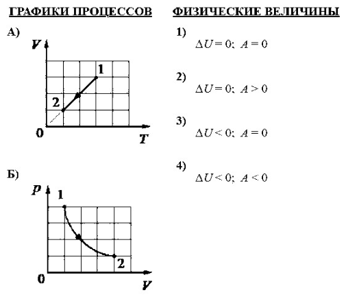 Установите соответствие между графиками процессов, в которых участвует 1 моль одноатомного идеального газа, и физическими величинами (ΔU-изменение внутренней энергии; А - работа газа), которые их характеризуют.
