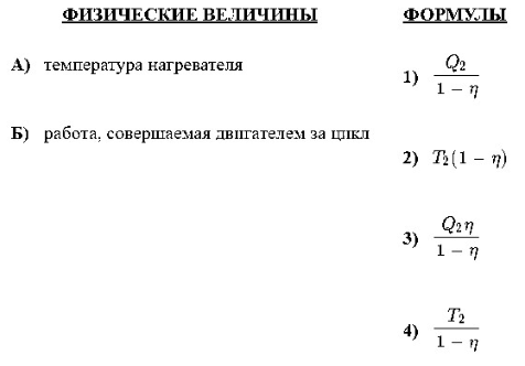 Температура холодильника идеального теплового двигателя, работающего по циклу Карно, равна T2, а коэффициент полезного действия этого двигателя равен За цикл двигатель отдаёт холодильнику количество теплоты Q2. Установите соответствие между физическими величинами и формулами, по которым их можно рассчитать.