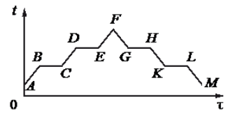 В цилиндре под поршнем первоначально находилось твёрдое вещество. Цилиндр сначала нагревали в печи, а затем он охлаждался. На рисунке показан график изменения температуры t вещества с течением времени τ.