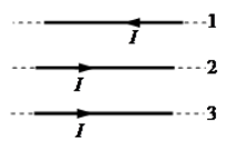 Как направлена относительно рисунка (вправо, влево, вверх, вниз, к наблюдателю, от наблюдателя) сила Ампера, действующая на проводник №2 со стороны двух других (см. рисунок), если все проводники тонкие, длинные, прямые, лежат в одной плоскости, параллельны друг другу и расстояния между соседними проводниками одинаковы? (I - сила тока.) Ответ запишите словом (словами).