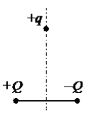 Положительный точечный заряд +q находится в поле двух неподвижных точечных зарядов: положительного +Q и отрицательного -Q (см. рисунок). Куда направлено относительно рисунка (вправо, влево, вверх, вниз, к наблюдателю, от наблюдателя) ускорение заряда +q в этот момент времени, если на него действуют только заряды +Q и -Q? Ответ запишите словом (словами).