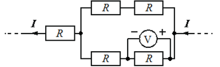 Пять одинаковых резисторов с сопротивлением 1 Ом соединены в электрическую цепь, через которую течёт ток 𝐼=2 А (см. рисунок). Какое напряжение показывает идеальный вольтметр?