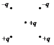 Как направлена относительно рисунка (вправо, влево, вверх, вниз, к наблюдателю, от наблюдателя) сила Кулона действующая на положительный точечный заряд + q, помещённый в центр квадрата, в вершинах которого находятся заряды: + q, + q, -q, -q (см. рисунок)? Все заряды неподвижны. Ответ запишите словом (словами).