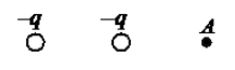 На рисунке представлено расположение двух неподвижных отрицательных точечных электрических зарядов: -q и –q. Как направлен относительно рисунка (вправо, влево, вверх, вниз, к наблюдателю, от наблюдателя) вектор напряжённости суммарного электрического поля этих зарядов в точке А? Ответ запишите словом (словами).