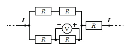 Пять одинаковых резисторов с сопротивлением 25 Ом каждый соединены в электрическую цепь, через которую течёт ток А (см. рисунок). Какое напряжение показывает идеальный вольтметр?