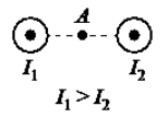 На рисунке показаны сечения двух параллельных длинных прямых проводников и направления токов в них. Сила тока I₁ в первом проводнике больше силы тока I₂ во втором. Куда направлен относительно рисунка (вправо, влево, вверх, вниз, к наблюдателю, от наблюдателя) вектор индукции магнитного поля этих проводников в точке А, расположенной точно посередине между проводниками? Ответ запишите словом (словами).