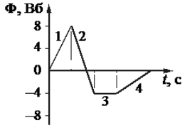 На рисунке показан график зависимости магнитного потока, пронизывающего контур, от времени. На каком из участков графика (1, 2, 3 или 4) в контуре возникает максимальная по модулю ЭДС индукции?