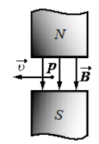 Протон p влетел в зазор между полюсами электромагнита со скоростью v, направленной влево. Вектор индукции B магнитного поля направлен вертикально вниз (см. рисунок). Куда направлена относительно рисунка (вправо, влево, вверх, вниз, к наблюдателю, от наблюдателя) действующая на протон сила Лоренца F? Ответ запишите словом (словами).
