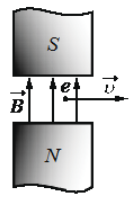 Электрон e влетел в зазор между полюсами электромагнита со скоростью v, направленной вправо. Вектор индукции B магнитного поля направлен вертикально вверх (см. рисунок). Куда направлена относительно рисунка (вправо, влево, вверх, вниз, к наблюдателю, от наблюдателя) действующая на протон сила Лоренца F? Ответ запишите словом (словами).