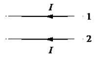 Как направлена относительно рисунка (вправо, влево, вверх, вниз, к наблюдателю, от наблюдателя) сила Ампера, действующая на проводник 1 со стороны проводника 2 (см. рисунок), если проводники тонкие, длинные, прямые, параллельны друг другу? (I – сила тока.) Ответ запишите словом (словами).