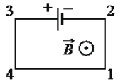 Электрическая цепь, состоящая из четырёх прямолинейных горизонтальных проводников (1–2, 2–3, 3–4, 4–1) и источника постоянного тока, находится в однородном магнитном поле, вектор магнитной индукции которого B направлен к наблюдателю (см. рисунок, вид сверху). Как направлена относительно рисунка (вправо, влево, вверх, вниз, к наблюдателю, от наблюдателя) вызванная этим полем сила Ампера, действующая на проводник 1–2? Ответ запишите словом (словами).