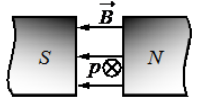 Протон p влетел в зазор между полюсами магнита со скоростью перпендикулярной вектору индукции магнитного поля (см. рисунок, значком показано направление движения протона). Куда направлена относительно рисунка (вправо, влево, вверх, вниз, к наблюдателю, от наблюдателя) действующая на протон сила Лоренца Ответ запишите словом (словами).
