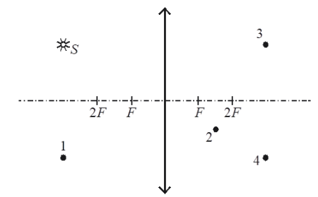 Какая из точек (1, 2, 3 или 4) является изображением точки S, полученным в тонкой собирающей линзе с фокусным расстоянием F (см. рисунок)?
