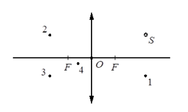 Какая из точек (1, 2, 3 или 4) является изображением точечного источника S, создаваемым тонкой собирающей линзой с фокусным расстоянием F ? (см. рисунок)
