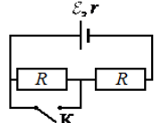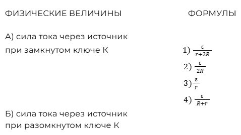 На рисунке показана цепь постоянного тока. Установите соответствие между физическими величинами и формулами, по которым их можно рассчитать ( ℰ– ЭДС источника тока, r – внутреннее сопротивление источника тока, R –сопротивление резистора).