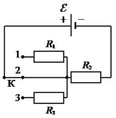 На рисунке показана цепь постоянного тока, содержащая источник постоянного напряжения с ЭДС ℰ и три резистора: R₁, R₂ и R₃. Как изменятся сила тока в цепи и напряжение на резисторе R₂, если ключ К перевести из положения 2 в положение 3? Внутренним сопротивлением источника пренебречь.