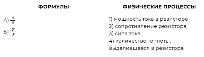 Установите соответствие между формулами для расчёта физических величин в цепях постоянного тока и названиями этих величин. В формулах использованы обозначения: R – сопротивление резистора; P – мощность тока в резисторе; U – напряжение на резисторе.