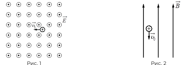 В первой экспериментальной установке положительно заряженная частица влетает в однородное электрическое поле так, что вектор v0 перпендикулярен вектору напряжённости электрического поля E (рис. 1). Во второй экспериментальной установке вектор v0 такой же частицы параллелен вектору индукции магнитного поля B (рис. 2).
