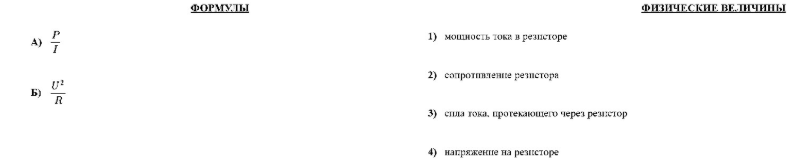 Установите соответствие между формулами для расчёта физических величин в цепях постоянного тока и названиями этих величин. В формулах использованы обозначения: P – мощность тока в резисторе; I – сила тока, протекающего через резистор; U – напряжение на резисторе; R – сопротивление резистора.