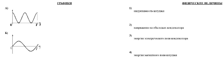 Графики А и Б представляют изменения физических величин, характеризующих колебания в контуре. Установите соответствие между графиками и физическими величинами, зависимость которых от времени эти графики могут представлять. К каждой позиции первого столбца подберите соответствующую позицию из второго столбца и запишите в таблицу выбранные цифры под соответствующими буквами.