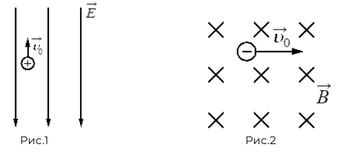 В первой экспериментальной установке положительно заряженная частица влетает в однородное электрическое поле так, что вектор скорости частицы параллелен вектору напряжённости электрического поля E (рис. 1). Во второй установке вектор скорости отрицательно заряженной частицы перпендикулярен вектору индукции магнитного поля B (рис. 2).