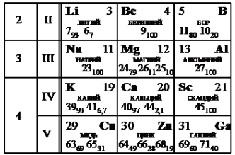 На рисунке представлен фрагмент Периодической системы элементов Д.И. Менделеева. Под названием каждого элемента приведены массовые числа его основных стабильных изотопов. При этом нижний индекс около массового числа указывает (в процентах) распространённость изотопа в природе.