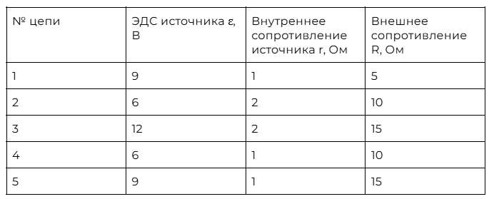 Ученик изучает законы постоянного тока. В его распоряжении имеется пять аналогичных электрических цепей (см. рисунок) с различными источниками и внешними сопротивлениями, характеристики которых указаны в таблице. Какие две цепи необходимо взять ученику для того, чтобы на опыте исследовать зависимость силы тока, протекающего в цепи, от внешнего сопротивления?