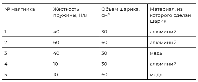 Ученику необходимо на опыте обнаружить зависимость периода свободных колебаний пружинного маятника от массы груза. У него имеется пять пружинных маятников, характеристики которых приведены в таблице. Какие два маятника необходимо взять ученику, чтобы провести данное исследование? Грузы сплошные.
