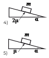Необходимо экспериментально изучить зависимость ускорения тела, скользящего по шероховатой наклонной плоскости, от коэффициента трения груза о плоскость. На всех приведённых ниже рисунках указаны массы тел, углы наклона плоскостей к горизонту, коэффициенты трения. Какие две установки следует использовать для проведения такого исследования?