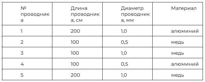 Для лабораторной работы по обнаружению зависимости сопротивления проводника от его длины ученику выдали пять проводников, характеристики которых указаны в таблице. Какие два из предложенных ниже проводников необходимо взять ученику, чтобы провести данное исследование?