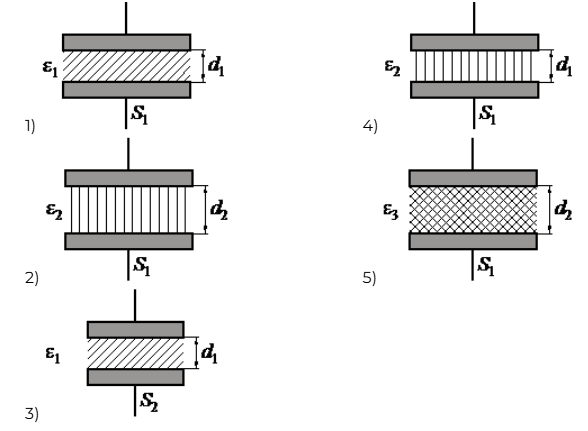Необходимо экспериментально изучить зависимость электроёмкости плоского конденсатора от площади его пластин. На всех представленных ниже рисунках S - площадь пластин конденсатора, d - расстояние между пластинами конденсатора, ε - диэлектрическая проницаемость среды, заполняющей пространство между пластинами. Какие два конденсатора следует использовать для проведения такого исследования?