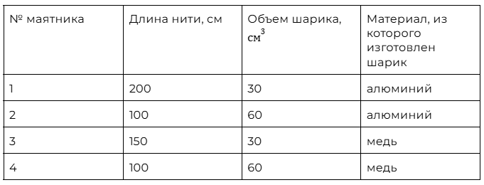 Ученику необходимо на опыте проверить, зависит ли период колебаний нитяного маятника от массы грузика. У него имеется пять маятников, характеристики которых приведены в таблице. Какие два маятника необходимо взять ученику, чтобы провести данное исследование?