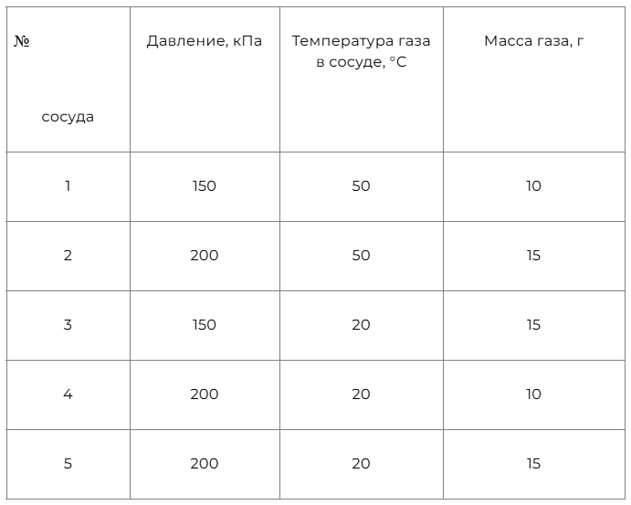 У него имеются пять различных сосудов с манометрами. Сосуды наполнены одним и тем же газом при различных температуре и давлении (см. таблицу). Какие два сосуда необходимо взять ученику, чтобы провести данное исследование?