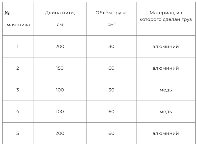 Ученику необходимо на опыте обнаружить зависимость частоты свободных колебаний нитяного маятника от длины нити. У него имеется пять маятников, характеристики которых приведены в таблице. Какие два маятника необходимо взять ученику, чтобы провести данное исследование?
