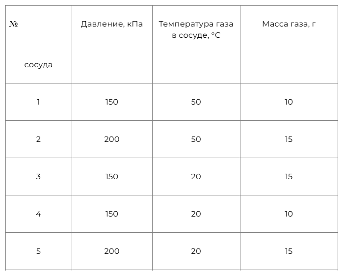 У него имеются пять различных сосудов с манометрами. Сосуды наполнены одним и тем же газом при различной температуре и давлении (см. таблицу).