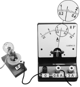 Чему равна сила тока в лампочке (см. рисунок), если погрешность прямого измерения силы тока амперметром на пределе измерения 3А равна ΔI1 = 0,15 А, а на пределе измерения 0,6 А равна ΔI2 = 0,03 А?