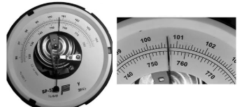 Запишите показания барометра с учётом абсолютной погрешности измерений. Верхняя шкала барометра проградуирована в кПа, нижняя – в мм рт. ст. Абсолютная погрешность прямого измерения барометра равна цене деления барометра.