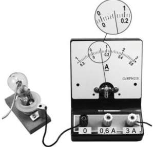 Определите силу тока в лампочке (см. рисунок), если погрешность прямого измерения силы тока равна цене деления амперметра.