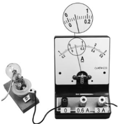 Определите силу тока в лампочке (см. рисунок), если погрешность прямого измерения силы тока равна цене деления амперметра.