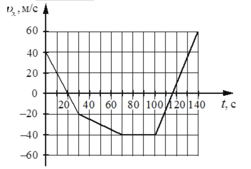 На рисунке показан график зависимости от времени для проекции vx скорости тела. Определите проекцию ax ускорения этого тела в интервале времени от 40 до 60 c? Ответ запишите с учетом знака проекции.