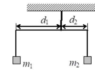 Коромысло весов, к которому подвешены на нитях два груза (см. рисунок), находится в равновесии. Массу первого груза увеличили в 2 раза. Во сколько раз нужно уменьшить плечо d1, чтобы равновесие сохранилось? (Коромысло и нити считать невесомыми.)