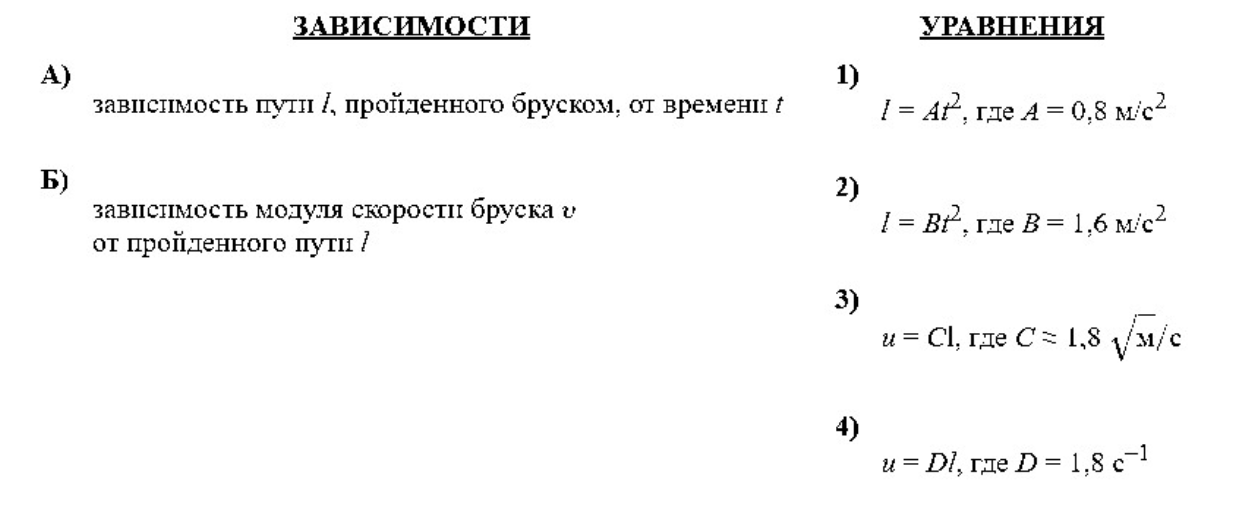 Ученик исследовал движение бруска по наклонной плоскости. Он определил, что брусок, начиная движение из состояния покоя, проходит 20см с ускорением 1,6 м/с2. Установите соответствие между зависимостями, полученными при исследовании движения бруска, и уравнениями, выражающими эти зависимости.