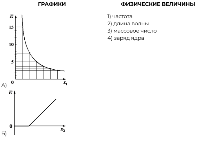 На графике А представлена зависимость энергии фотонов, падающих на катод, от физической величины x1, а на графике Б - зависимость максимальной кинетической энергии фотоэлектронов от физической величины x2